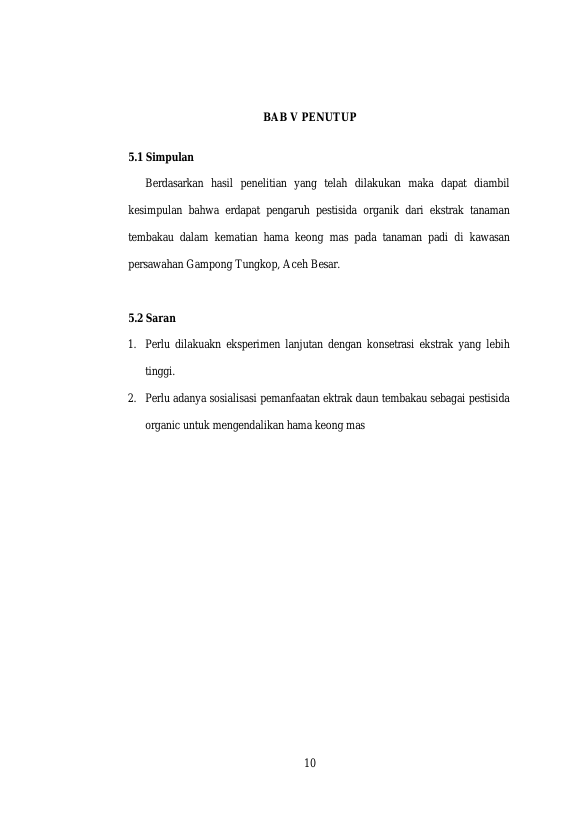 Nova Emiliani, PEMANFAATAN EKSTRAK TANAMAN TEMBAKAU (NICOTIANAE TOBACUM L) SEBAGAI PESTISIDA ORGANIK UNTUK PENGENDALIAN HAMA KEONG MAS (POMACEACE CANALICULARA L ) DI KAWASAN PERSAWAHAN GAMPONG TUNGKOP ACEH BESAR. Banda Aceh FAKULTAS KEGURUAN DAN ILMU PENDIDIKAN UNIVERSITAS SYIAH KUALA,2016