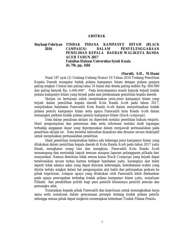 Bayhaqi Febriyan, TINDAK PIDANA KAMPANYE HITAM (BLACK CAMPAIGN) DALAM PENYELENGGARAAN PEMILIHAN KEPALA DAERAH WALIKOTA BANDA ACEH TAHUN 2017. Banda Aceh Fakultas Hukum Universitas Syiah Kuala,2016