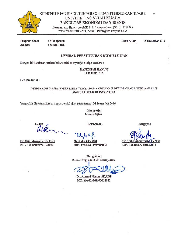 Rafidhah Hanum, PENGARUH MANAJEMEN LABA TERHADAP KEBIJAKAN DIVIDEN PADA PERUSAHAAN MANUFAKTUR DI INDONESIA. Banda Aceh FAKULTAS EKONOMI BISNIS UNIVERSITAS SYIAH KUALA,2016