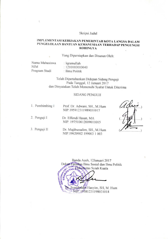 Iqramullah, IMPLEMENTASI KEBIJAKAN PEMERINTAH KOTA LANGSA DALAM PENGELOLAAN BANTUAN KEMANUSIAAN TERHADAP PENGUNGSI ROHINGYA. Banda Aceh FAKULTAS ILMU SOSIAL DAN ILMU POLITIK UNIVERSITAS SYIAH KUALA,2016