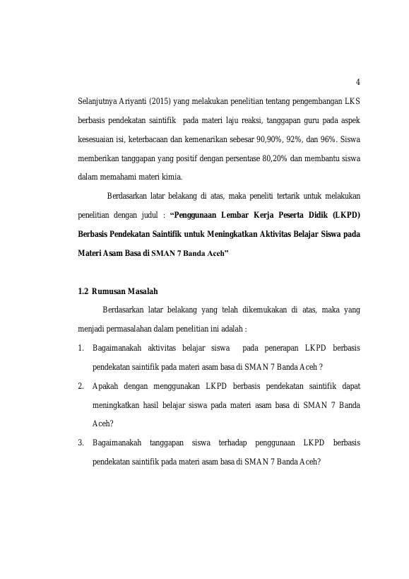 laili fidhriyani, PENGGUNAAN LKPD BERBASIS PENDEKATAN SAINTIFIK UNTUK MENINGKATKAN AKTIVITAS BELAJAR SISWA PADA MATERI ASAM BASA DI SMAN 7 BANDA ACEH. Banda Aceh FAKULTAS KEGURUAN DAN ILMU PENDIDIKAN UNIVERSITAS SYIAH KUALA,2015