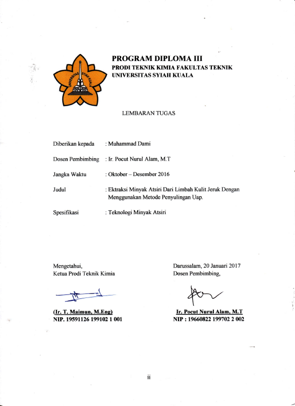 Muhammad dami, EKSTRAKSI MINYAK ATSIRI DARI LIMBAH KULIT JERUK DENGAN MENGGUNAKAN METODE PENYULINGAN UAP. Banda Aceh Fakultas Teknik,2017