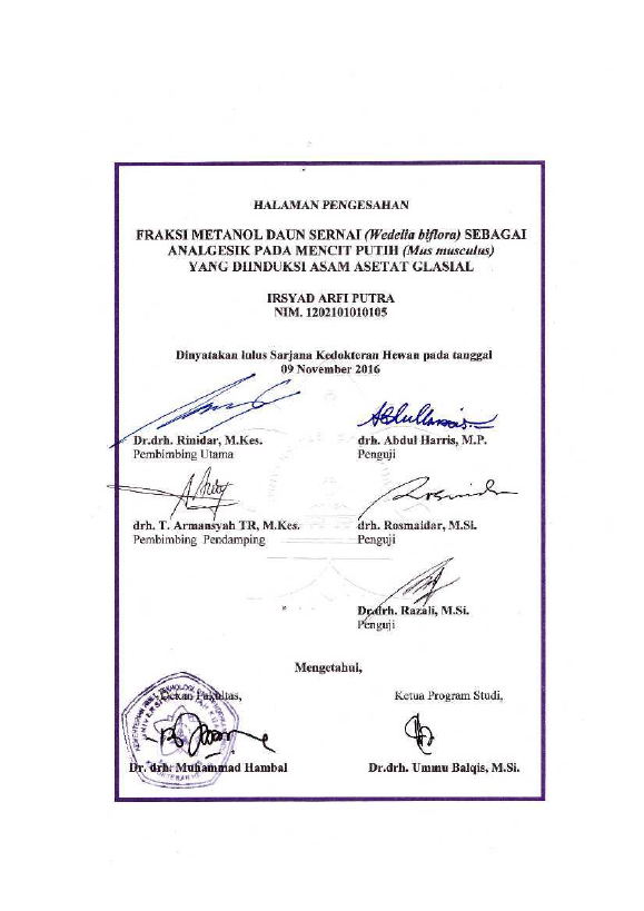 Baca Juga : UJI ANALGESIK FRAKSI ETIL ASETAT DAUN SERNAI (WEDELIA BIFLORA) PADA MENCIT (MUS MUSCULUS) (Azhyumardi, 2015)