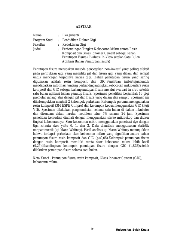 Baca Juga : PERBANDINGAN TINGKAT KEBOCORAN MIKRO ANTARA RESIN KOMPOSIT DAN GLASS IONOMER CEMENT (GIC) SEBAGAI BAHAN PENUTUPAN FISURA (Darma Jayadi, 2016)