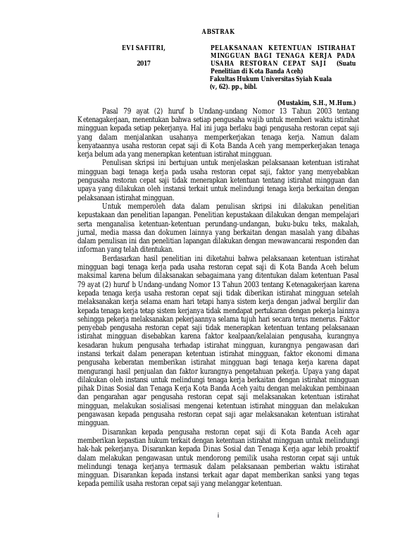 Evi Safitri, PELAKSANAAN KETENTUAN ISTIRAHAT MINGGUAN BAGI TENAGA KERJA PADA USAHA RESTORAN CEPAT SAJI (SUATU PENELITIAN DI KOTA BANDA ACEH). Banda Aceh Fakultas Hukum Universitas Syiah Kuala,2017