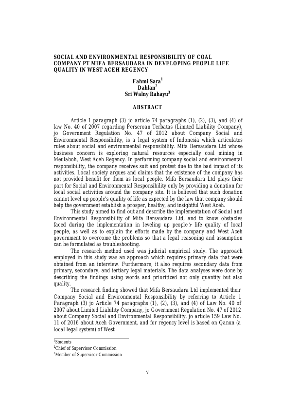 Fahmi Sara, TANGGUNG JAWAB SOSIAL DAN LINGKUNGAN PERUSAHAAN BATUBARA PT MIFA BERSAUDARA DALAM PENINGKATAN KUALITAS HIDUP MASYARAKAT KABUPATEN ACEH BARAT. Banda Aceh Program Studi Magister Ilmu Hukum,2016