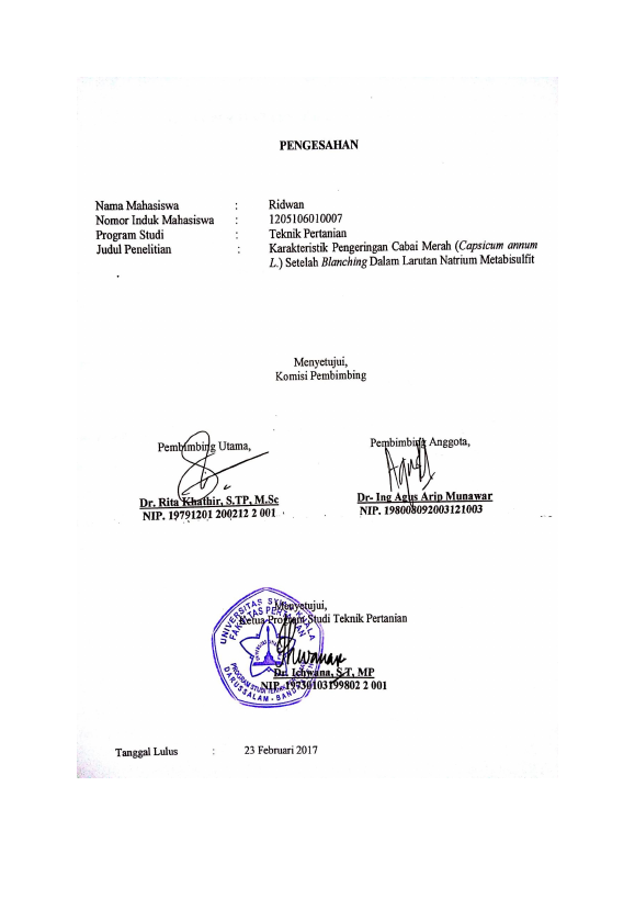 Ridwan, KARAKTERISTIK PENGERINGAN CABAI MERAH (CAPSICUM ANNUM L.) SETELAH BLANCHING DALAM LARUTAN NATRIUM METABISULFIT. Banda Aceh Universitas Syiah Kuala,2017
