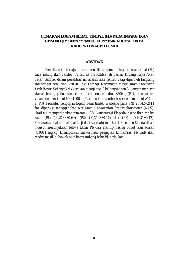 CEMARAN LOGAM BERAT TIMBAL (PB) PADA INSANG IKAN CENDRO (TYLOSURUS CROCODILUS) DI PESISIR KRUENG RAYA KABUPATEN ACEH BESAR (HEAVY METAL CONTAMINATION OF LEAD (PB) ON THE GILLS OF NEEDLEFISH (TYLOSURUS CROCODILUS) AT KRUENG RAYA ACEH BESAR). Banda Aceh FAKULTAS KEDOKTERAN HEWAN UNIVERSITAS SYIAH KUALA,2017