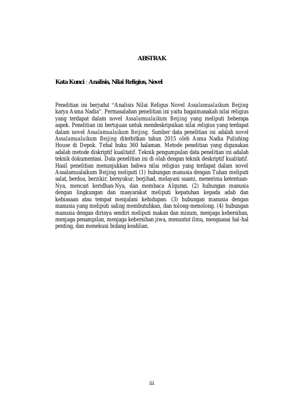Yuliani, ANALISIS NILAI RELIGIUS DALAM NOVEL ASSALAMUALAIKUM BEIJING KARYA ASMA NADIA. Banda Aceh Universitas Syiah Kuala,2017