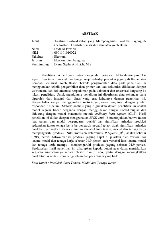 Dodi Alfawirsa, Analisis Faktor-Faktor yang Mempengaruhi Produksi Jagung dI Kecamatan Lembah Seulawah Kabupaten Aceh Besar. Banda Aceh Fakultas Ekonomi,2014