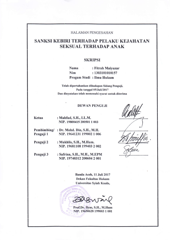 FITRAH MAIYUZAR, SANKSI KEBIRI TERHADAP PELAKU KEJAHATAN SEKSUAL TERHADAP ANAK. Banda Aceh Fakultas Hukum Universitas Syiah Kuala,2017
