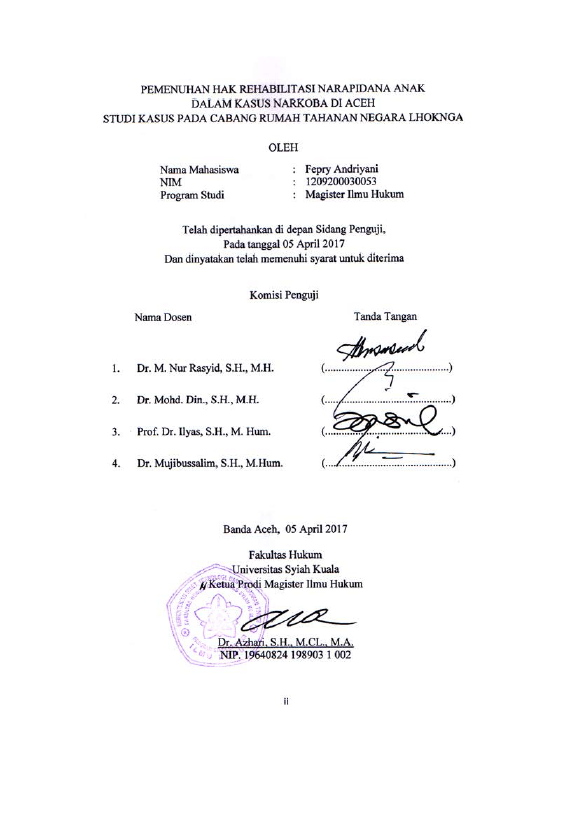 Fepry Andiyani, PEMENUHAN HAK REHABILITASI NARAPIDANA ANAK KASUS NARKOBA DI ACEH STUDI KASUS PADA CABANG RUMAH TAHANAN NEGARA LHOKNGA. Banda Aceh Program Studi Magister llmu Hukum,2017