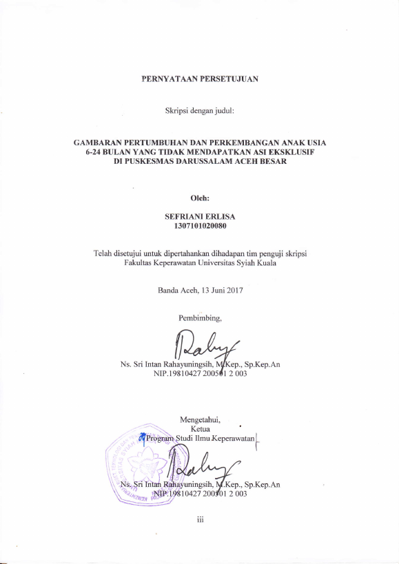 SEFRIANI ERLISA, GAMBARAN PERTUMBUHAN DAN PERKEMBANGAN ANAK USIA 6-24 BULAN YANG TIDAK MENDAPATKAN ASI EKSKLUSIF DI PUSKESMAS DARUSSALAM ACEH BESAR. Banda Aceh fakultas keperawatan universitas syiah kuala,2017