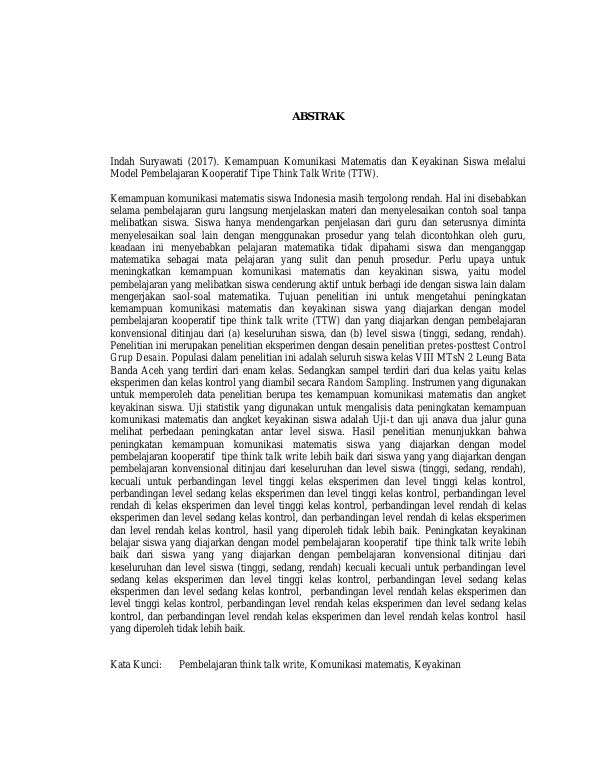 Indah Suryawati, KEMAMPUAN KOMUNIKASI MATEMATIS DAN KEYAKINAN SISWA MELALUI MODEL PEMBELAJARAN THINK TALK WRITE (TTW). Banda Aceh Program Studi Magister Pendidikan Matematika Universitas Syiah Kuala,2017