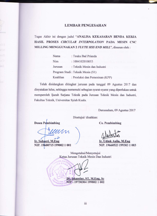 Baca Juga : ANALISA KEKASARAN BENDA KERJA HASIL PROSES CIRCULAR INTERPOLATION PADA MESIN CNC MILLING MENGGUNAKAN 2 FLUTE HSS END MILL (Teuku Ibal Prianda, 2017)