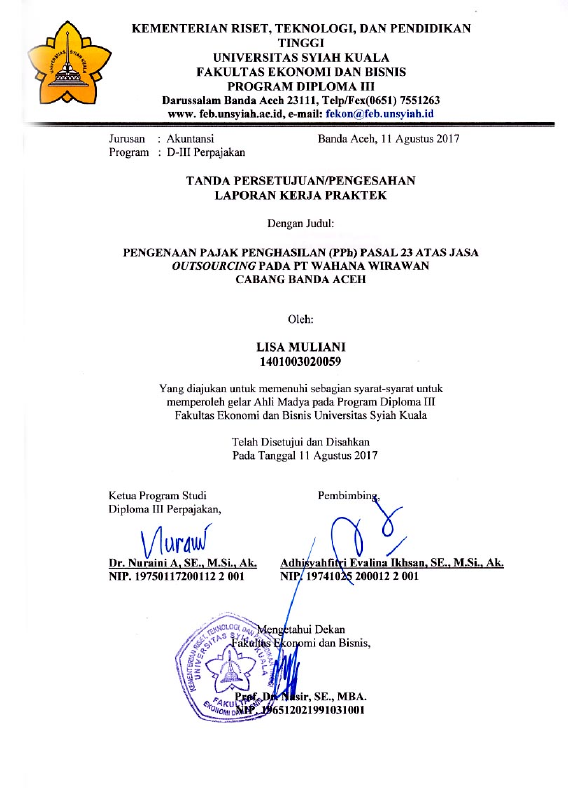 LISA MULIANI, PENGENAAN PAJAK PENGHASILAN (PPH) PASAL 23 ATAS JASA OUTSOURCING PADA PT WAHANA WIRAWAN CABANG BANDA ACEH. Banda Aceh FAKULTAS EKONOMI BISNIS UNIVERSITAS SYIAH KUALA,2017