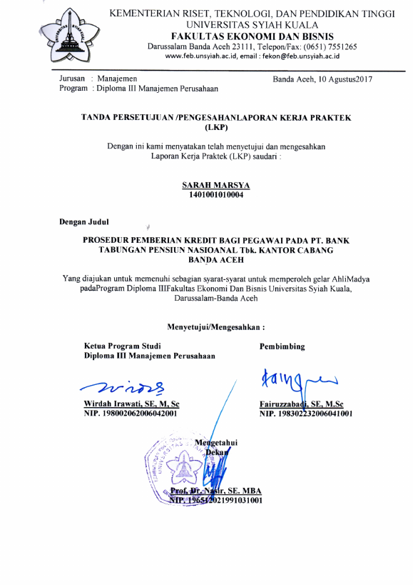 SARAH MARSYA, PROSEDUR PEMBERIAN KREDIT BAGI PEGAWAI PADA PT. BANK TABUNGAN PENSIUN NASIONAL TBK. KANTOR CABANG BANDA ACEH. Banda Aceh Universitas Syiah Kuala,2017