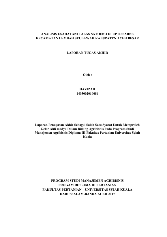Hazizah, ANALISIS USAHATANI TALAS SATOIMO DI UPTD SAREE KECAMATAN LEMBAH SEULAWAH KABUPATEN ACEH BESAR. Banda Aceh Universitas Syiah Kuala,2017