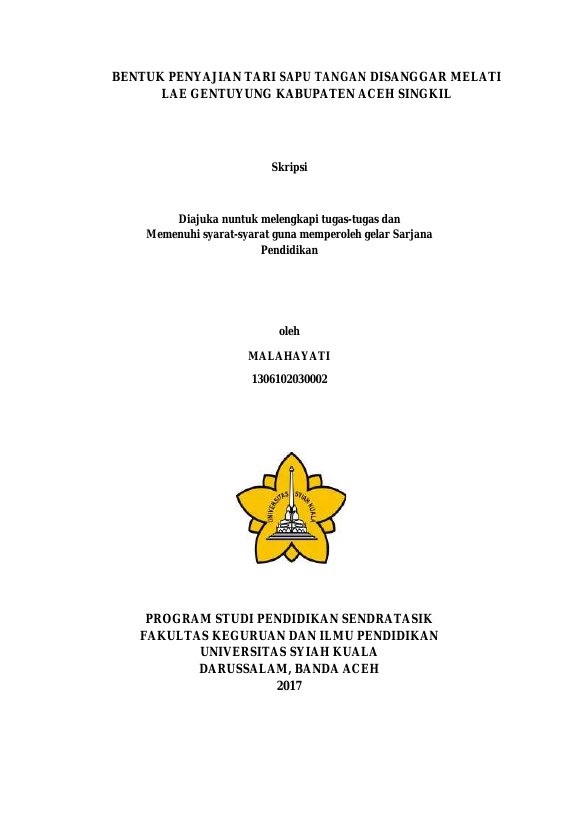 Malahayati, BENTUK PENYAJIAN TARI SAPU TANGAN DISANGGAR MELATI LAE GENTUYUNG KABUPATEN ACEH SINGKIL. Banda Aceh Universitas Syiah Kuala,2017