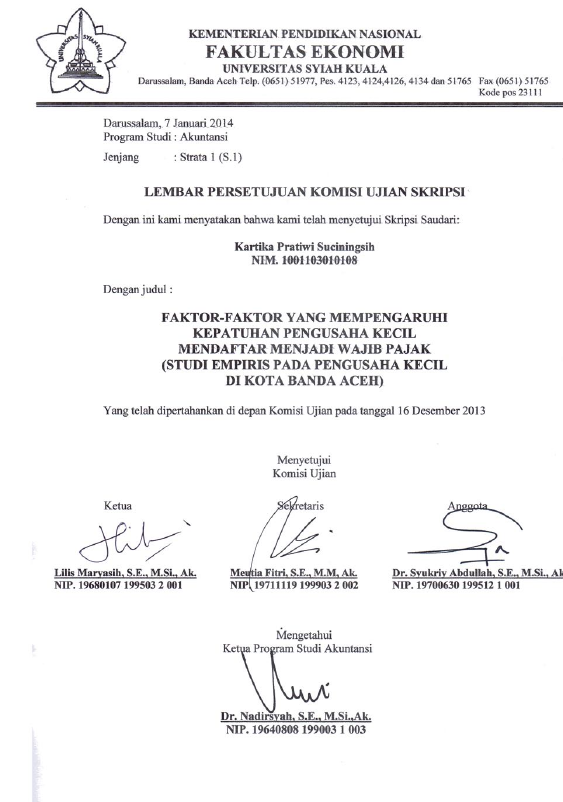 KARTIKA PRATIWI S, FAKTOR-FAKTOR YANG MEMPENGARUHI KEPATUHAN PENGUSAHA KECIL MENDAFTAR MENJADI WAJIB PAJAK (STUDI EMPIRIS PADA PENGUSAHA KECIL DI KOTA BANDA ACEH). Banda Aceh Fakultas Ekonomi,2013