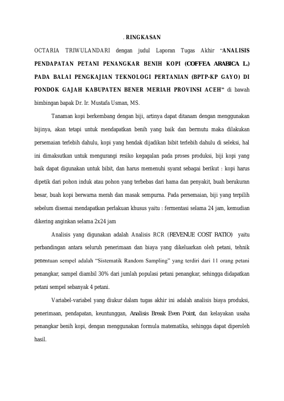 Octaria Triwulandari, ANALISIS PENDAPATAN PETANI PENANGKAR BENIH KOPI (COFFEA ARABICA L.) PADA BALAI PENGKAJIAN TEKNOLOGI PERTANIAN (BPTP-KP GAYO) DI PONDOK GAJAH KABUPATEN BENER MERIAH PROVINSI ACEH. Banda Aceh Fakultas Pertanian Universitas Syiah Kuala,2017