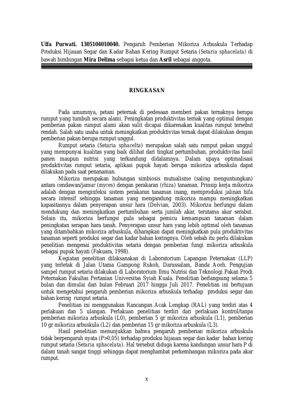 Ulfa Purwati, PENGARUH PEMBERIAN MIKORIZA ARBUSKULA TERHADAP PRODUKSI HIJAUAN SEGAR DAN KADAR BAHAN KERING RUMPUT SETARIA (SETARIA SPHACELATA). Banda Aceh Fakultas Pertanian Universitas Syiah Kuala,2017