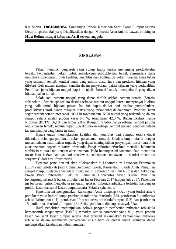 RIA SAGITA, KANDUNGAN PROTEIN KASAR DAN SERAT KASAR RUMPUT SETARIA (SETARIA SPHACELATA) YANG DIAPLIKASIKAN DENGAN MIKORIZA ARBUSKULA. Banda Aceh Universitas Syiah Kuala,2017