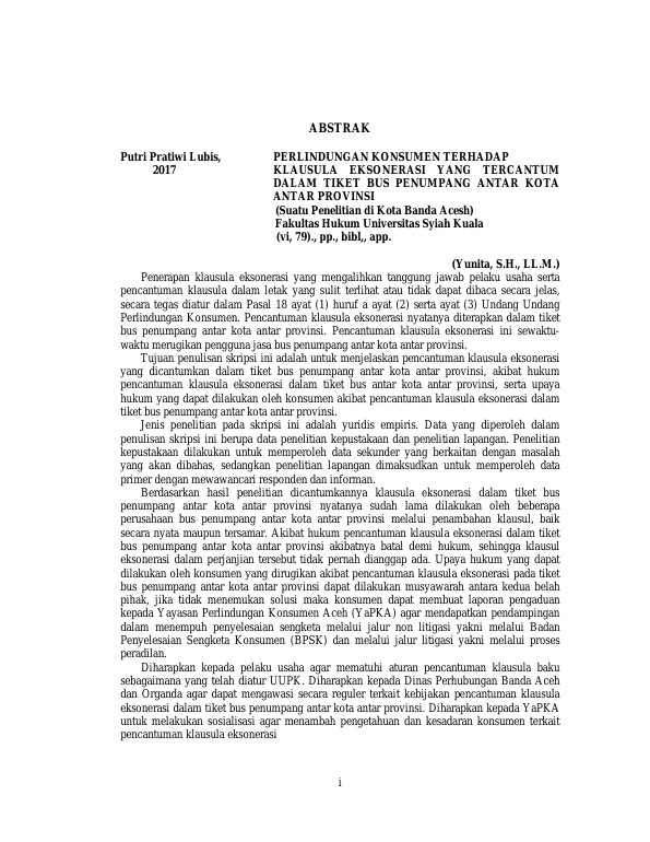 Putri Pratiwi Lubis, PERLINDUNGAN KONSUMEN TERHADAP PENCANTUMAN KLAUSULA EKSONERASI DALAM TIKET BUS PENUMPANG ANTAR KOTA ANTAR PROVINSI (SUATU PENELITIAN DI KOTA BANDA ACEH). Banda Aceh PROGRAM STUDI PENDIDIKAN JASMANI, KESEHATAN DAN REKREASI JURUSAN PENDIDIKAN OLAHRGA FAKULTAS KEGURUA,2017