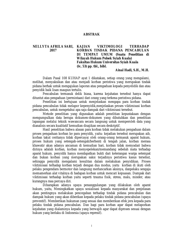 Nellyta Afrila Sari, KAJIAN VIKTIMOLOGI TERHADAP KORBAN TINDAK PIDANA PENCABULAN DI TEMPAT UMUM (SUATU PENELITIAN DI WILAYAH HUKUM POLSEK SYIAH KUALA). Banda Aceh Fakultas Hukum Universitas Syiah Kuala,2017