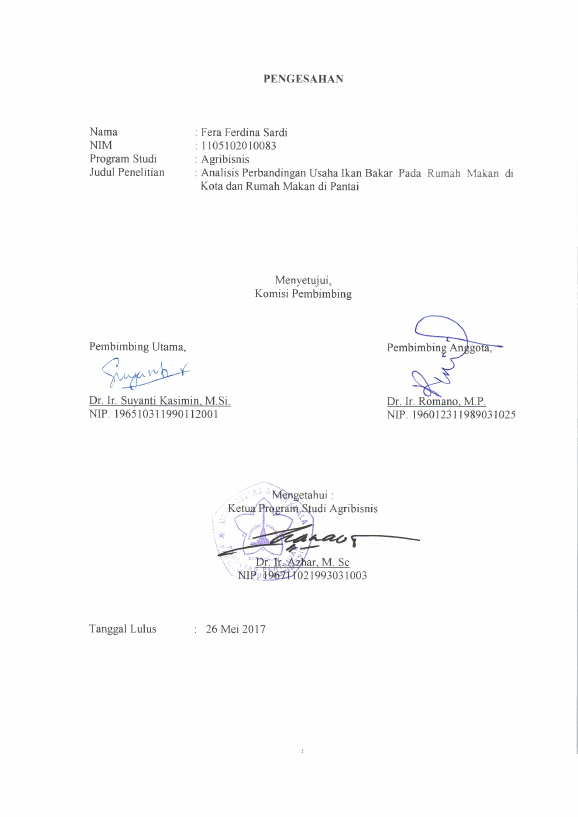 Fera Ferdina Sardi, ANALISIS PERBANDINGAN USAHA IKAN BAKAR PADA RUMAH MAKAN DI KOTA DAN RUMAH MAKAN DI PANTAI (STUDI KASUS PADA RUMAH MAKAN LAMNYONG BANDA ACEH DAN PANTAI LAMPU’UK KABUPATEN ACEH BESAR). Banda Aceh Universitas Syiah Kuala,2017