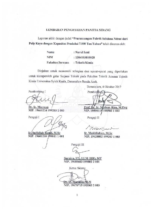 Nurul Ismi, PRARANCANGAN PABRIK SELULOSA NITRAT DARI PULP KAYU DENGAN KAPASITAS PRODUKSI 7.000 TON/TAHUN. Banda Aceh FAKULTAS TEKNIK UNIVERSITAS SYIAH KUALA,2017