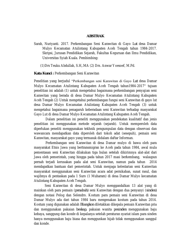 Baca Juga : PENYAJIAN SENI KARAWITAN PADA KEGIATAN ADAT DI DESA DAMAR MULYO KABUPATEN ACEH TENGAH (Rati Eva Zulaiha, 2018)