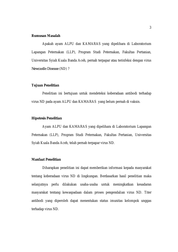 Fitria Sastra Mita, DETEKSI TITER ANTIBODI VIRUS NEWCASTLE DISEASE(ND) PADA AYAM ALPU DAN KAMARAS. Banda Aceh Universitas Syiah Kuala,2017
