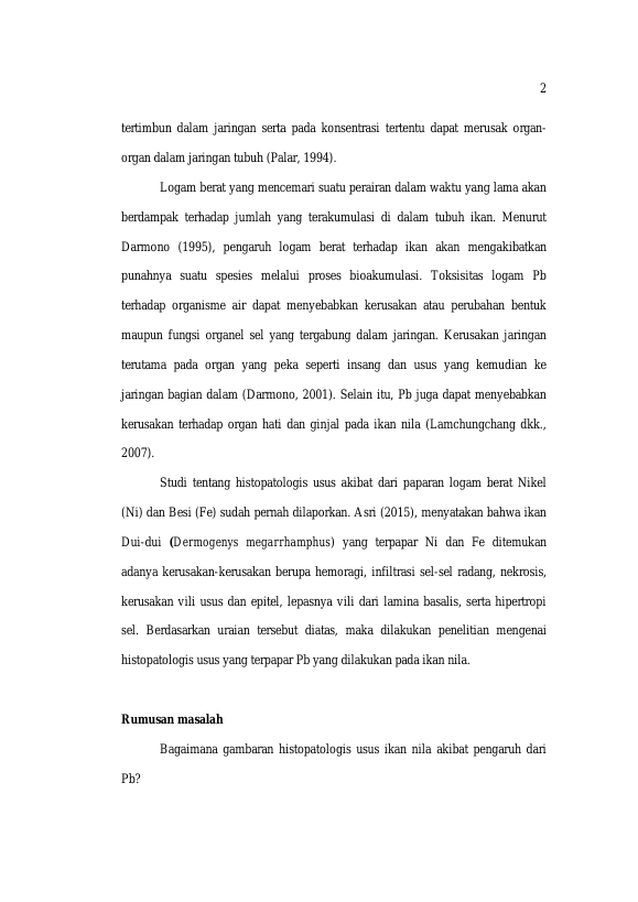 Baca Juga : PENGARUH PAPARAN TIMBAL (PB) TERHADAP HISTOPATOLOGIS USUS IKAN NILA (OREOCHROMIS NILLOTICUS) (Rina Ismaya, 2017)