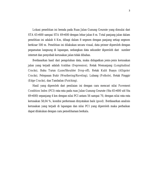 Rias Sri Murnisa, EVALUASI TINGKAT KERUSAKAN JALAN UNTUK MENENTUKAN JENIS PENANGANAN DENGAN MENGGUNAKAN METODE PCI (PAVEMENT CONDITION INDEX) (STUDI KASUS JALAN GUNUNG GEURUTE STA 65+600 – STA 69+600). Banda Aceh Universitas Syiah Kuala,2017