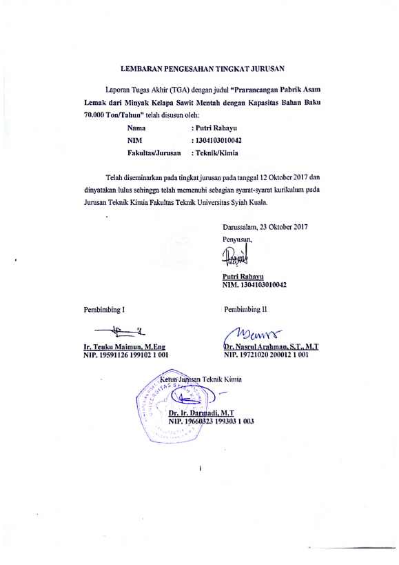 Baca Juga : PRARANCANGAN PABRIK ASAM LEMAK DARI MINYAK KELAPA SAWIT MENTAH DENGAN KAPASITAS BAHAN BAKU 70.000 TON/TAHUN (Fikriatul Arifah Hsb, 2017)