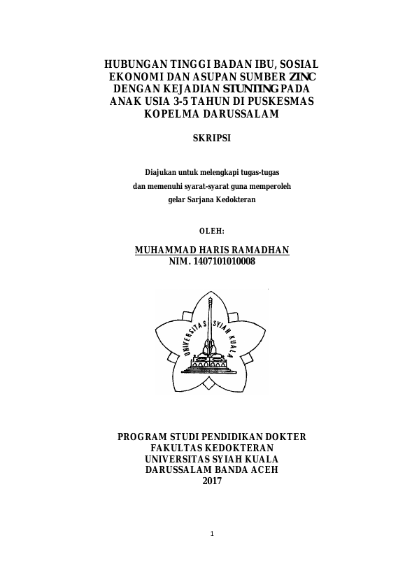 Muhammad Haris Ramadhan, HUBUNGAN TINGGI BADAN IBU, SOSIAL EKONOMI DAN ASUPAN SUMBER ZINC DENGAN KEJADIAN STUNTING PADA ANAK USIA 3-5 TAHUN DI PUSKESMAS KOPELMA DARUSSALAM. Banda Aceh Universitas Syiah Kuala,2017
