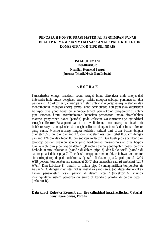 ISLAHUL UMAM, PENGARUH KONFIGURASI MATERIAL PENYIMPAN PANAS TERHADAP KEMAMPUAN MEMANASKAN AIR PADA KOLEKTOR KONSENTRATOR TIPE SILINDRIS. Banda Aceh Universitas Syiah Kuala,2018