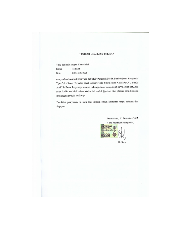 Baca Juga : PENGARUH MODEL PEMBELAJARAN KOOPERATIF TIPE PAIR CHECKS TERHADAP HASIL BELAJAR FISIKA SISWA KELAS X DI SMAN 2 BANDA ACEH (Helliana, 2018)