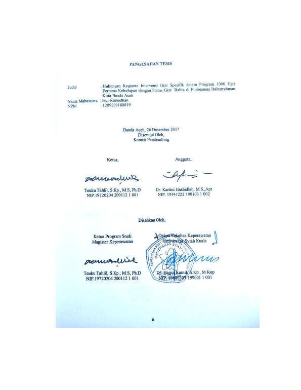 Nur Ramadhan, HUBUNGAN KEGIATAN INTERVENSI GIZI SPESIFIK DALAM PROGRAM 1000 HARI PERTAMA KEHIDUPAN DENGAN STATUS GIZI BALITA DI PUSKESMAS BAITURRAHMAN KOTA BANDA ACEH. Banda Aceh Program Studi Magister Keperawatan Universita Syiah Kuala,2017