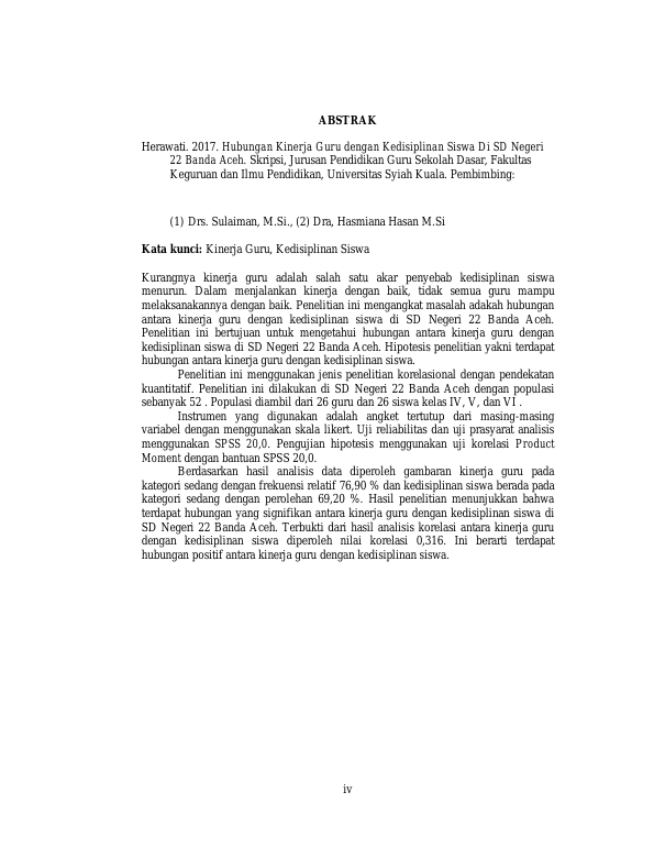 Herawati, HUBUNGAN KINERJA GURU DENGAN KEDISIPLINAN SISWA DI SD NEGERI 22 BANDA ACEH. Banda Aceh Universitas Syiah Kuala,2018