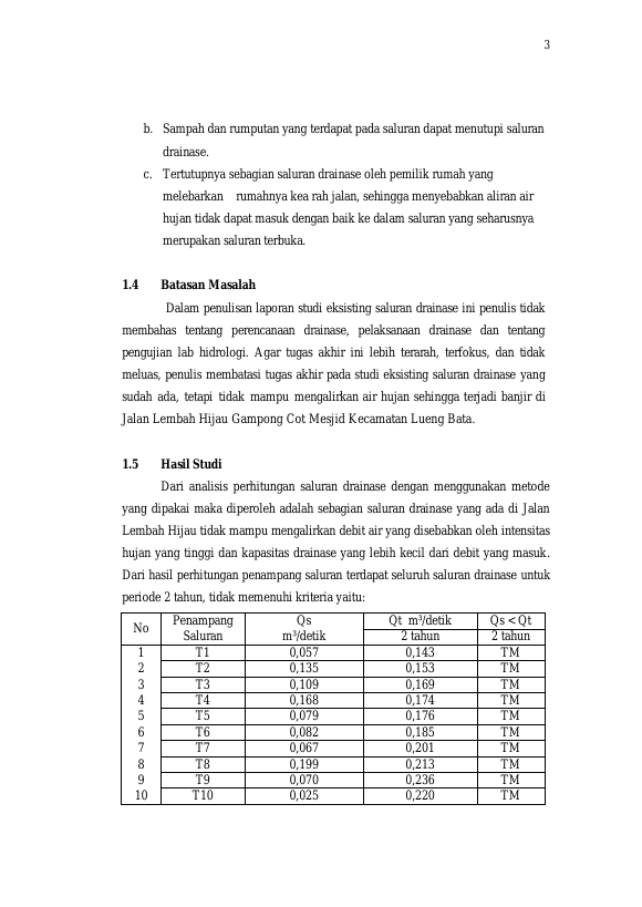 Dedek Aris Munandar, STUDI EKSISTING SALURAN DRAINASE DI KAWASAN JALAN LEMBAH HIJAU GAMPONG COT MESJID KECAMATAN LUENG BATA KOTA BANDA ACEH. Banda Aceh Universitas Syiah Kuala,2018