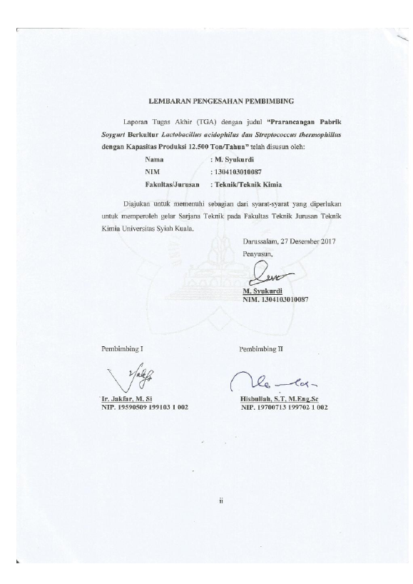 M SYUKURDI, PRARANCANGAN PABRIK SOYGURT BERKULTUR LACTOBACILLUS ACIDOPHILUS DAN STREPTOCOCCUS THERMOPHILLUS DENGAN KAPASITAS 12.500 TON/TAHUN. Banda Aceh Universitas Syiah Kuala,2018