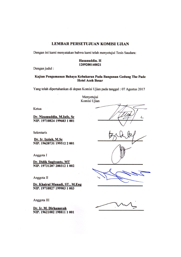Hasanuddin H, KAJIAN PENGAMANAN BAHAYA KEBAKARAN PADA BANGUNAN GEDUNG THE PADE HOTEL ACEH BESAR. Banda Aceh Program Studi Magister Ilmu Kebencanaan Universitas Syiah Kuala,2017