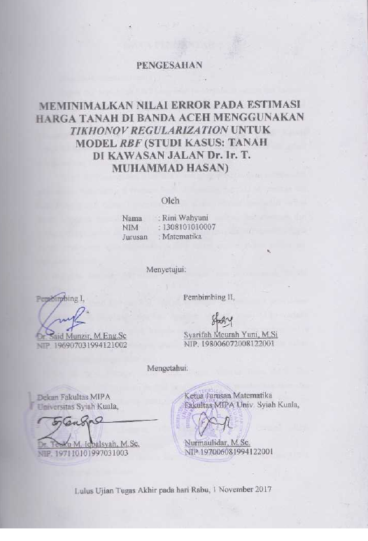 Rini Wahyuni, MEMINIMALKAN NILAI ERROR PADA ESTIMASI HARGA TANAH DI BANDA ACEH MENGGUNAKAN TIKHONOV REGULARIZATION UNTUK MODEL RBF (STUDI KASUS: TANAH DI KAWASAN JLN. DR. IR. T. MUHAMMAD HASAN). Banda Aceh Universitas Syiah Kuala,2018