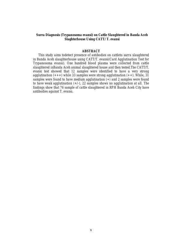Baca Juga : DIAGNOSA SURRA (TRYPANOSOMA EVANSI) PADA KERBAU YANG DIPOTONG DI RPH BANDA ACEH DAN ACEH BESAR BERDASARKAN PEMERIKSAAN CARD AGGLUTINATION TEST FOR TRYPANOSOMA EVANSI (CATT) (KARTIKA AMIRA, 2018)