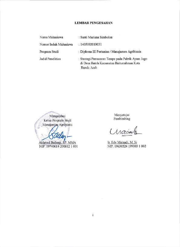 SANTI MARIANA SIMBOLON, STRATEGI PEMASARAN TEMPE PADA PABRIK AYAM JAGO DI DESA BATOH KECAMATAN BAITURRAHMAN KOTA BANDA ACEH. Banda Aceh Fakultas Pertanian,2018