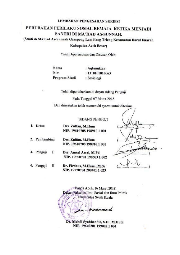 AQLUNNIZAR, PERUBAHAN PERILAKU SOSIAL REMAJA KETIKA MENJADI SANTRI DI MA’HAD AS-SUNNAH. (STUDI DI MA’HAD AS-SUNNAH GAMPONG LAMBLANG TRIENG KECAMATAN DARUL IMARAH KABUPATEN ACEH BESAR). Banda Aceh Universitas Syiah Kuala,2018