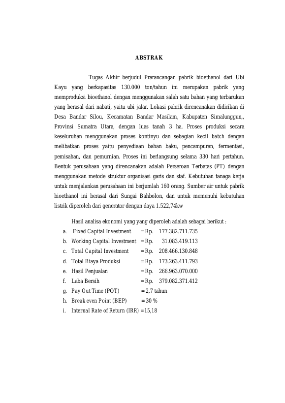 Baca Juga : PRARANCANGAN PABRIK BIOETHANOL DARI JAGUNG DAN UBI KAYU DENGAN KAPASITAS BAHAN BAKU 72.000 TON/TAHUN (Fahirul Muhar, 2014)