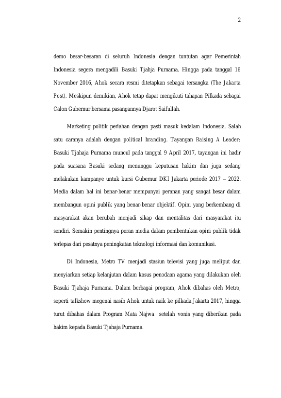 SITI SHARRAH DZUNDZA, POLITICAL BRANDING BASUKI TJAHAJA PURNAMA DALAM BERITA PENISTAAN AGAMA DI METRO TV. Banda Aceh Universitas Syiah Kuala,2018